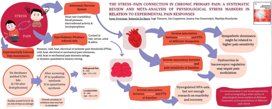 Vyverman, J., De Baere, R., Timmers, I., Coppieters, I., Van Oosterwijck, J., & Moerkerke, M. (2026).The stress–pain connection in chronic primary pain: A systematic review and meta-analysis of physiological stress markers in relation to experimental pain responses.Neuroscience & Biobehavioral Reviews, 184, 106604.https://doi.org/10.1016/j.neubiorev.2026.106604
